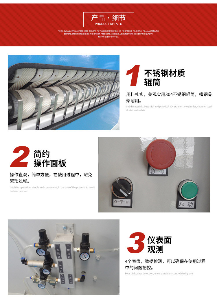燙平機采用不銹鋼烘筒加熱,散熱效率高,表面光潔平整,熨燙效果好。燙平機特有石墨密封旋轉(zhuǎn)接頭,保證密封性能。燙平機熨燙速度無級調(diào)速,結(jié)構(gòu)合理,達到靜音效果。燙平機采用疏水系統(tǒng),提高熱效率,降低使用成本。 燙平機變頻調(diào)速系統(tǒng),節(jié)能、高效、平穩(wěn),齒輪鏈條傳動系統(tǒng),工作可靠,噪音低。燙平機配以專業(yè)生產(chǎn)廠家的熨燙錠帶,變形小,壽命長,熨痕小。燙平機外接蒸氣和電加熱多種機型可供選擇。